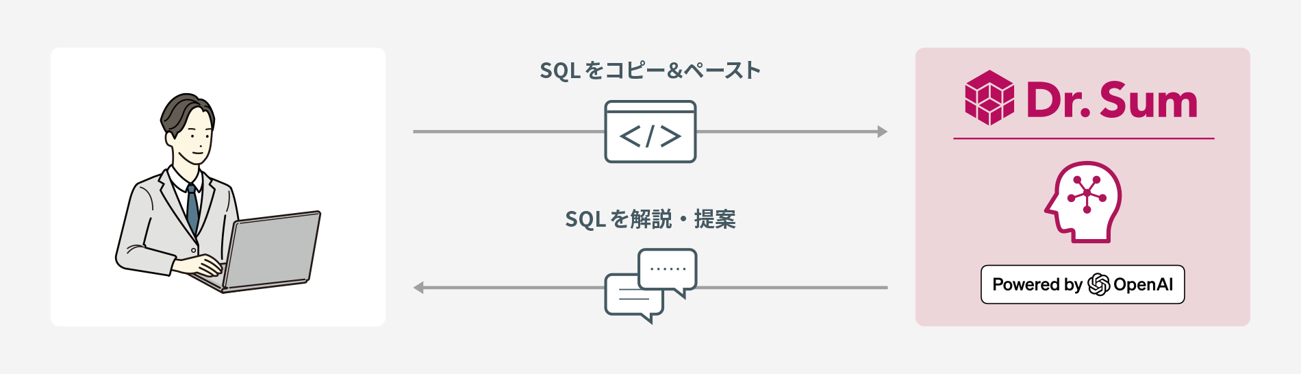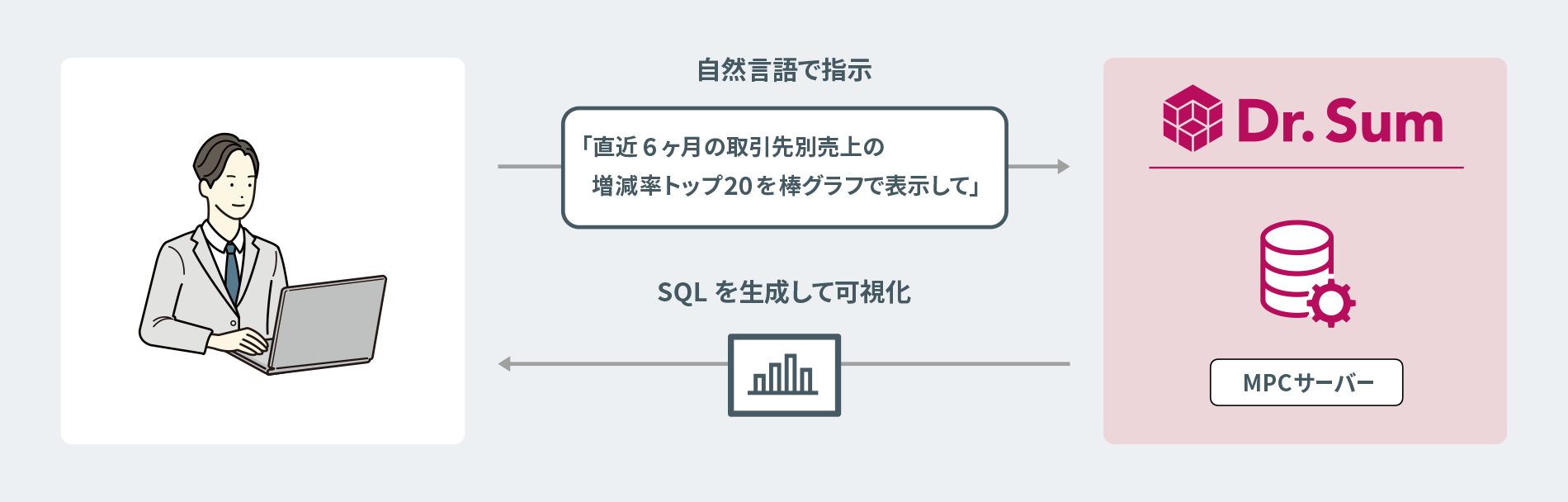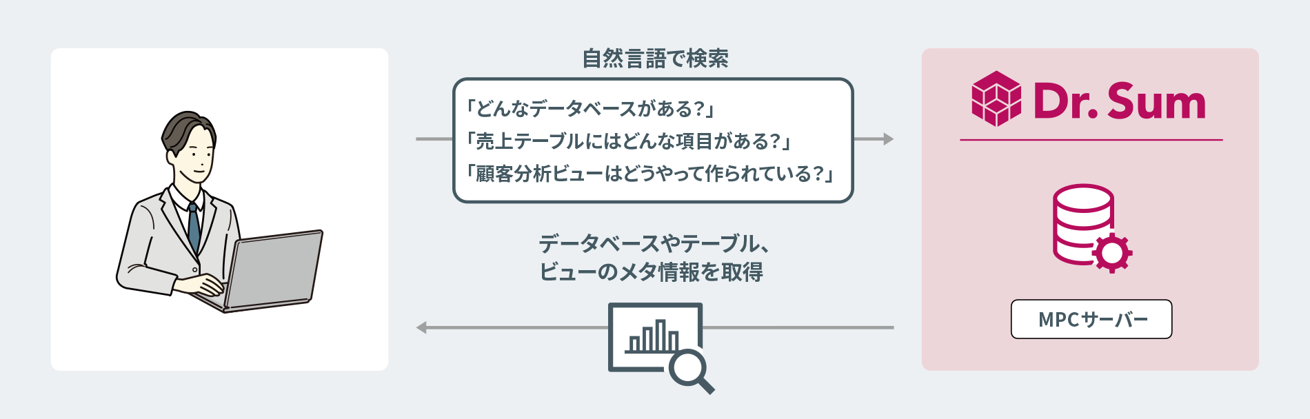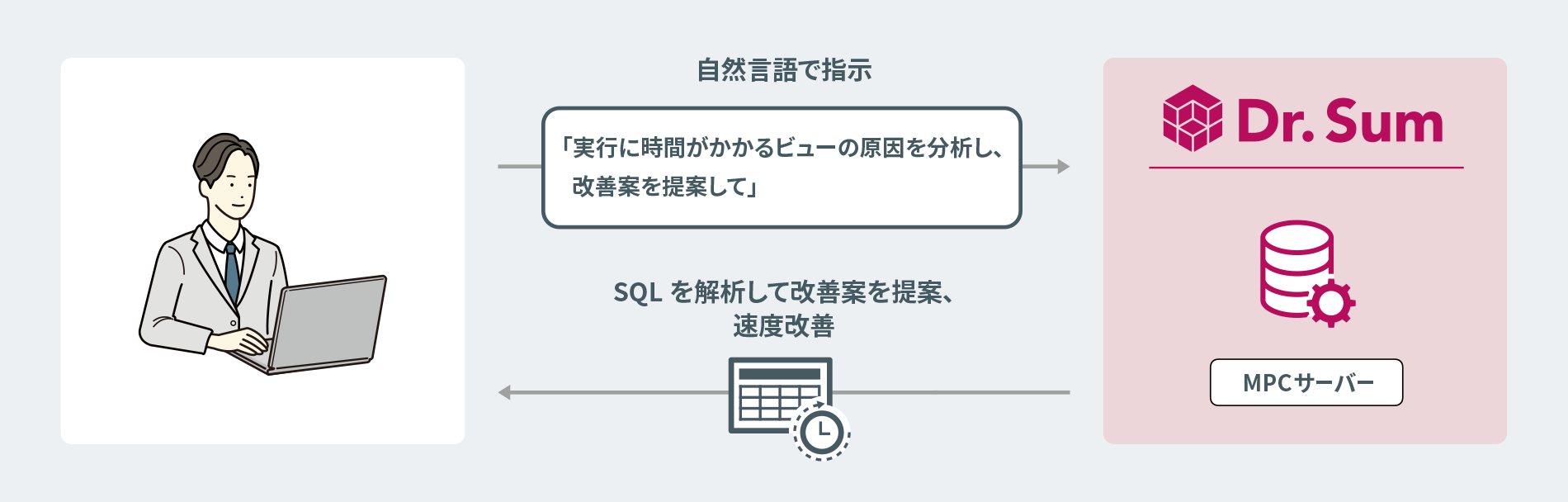 生成AIとDr.Sumを繋ぐことで、AIツールから対話形式でデータベース管理や操作、