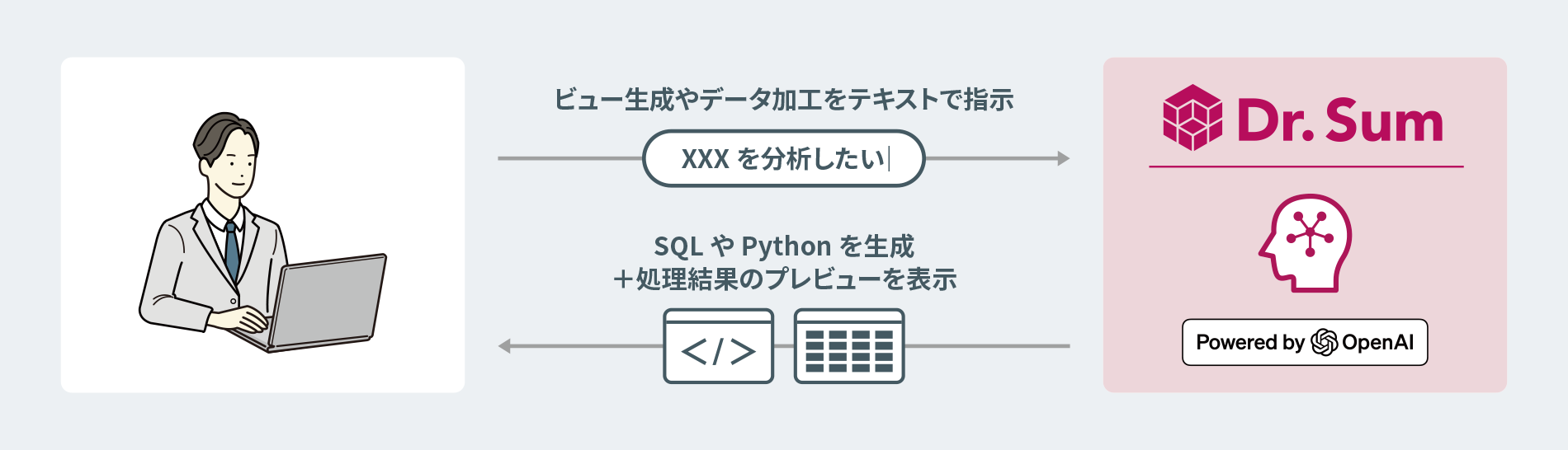 Dr.Sum CopilotがOpenAIと連携してSQLやPythonを生成します。