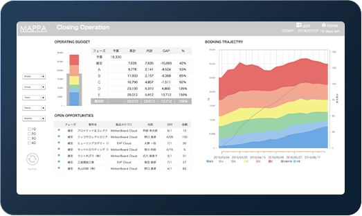 営業実績管理ボードは、営業部の予算に対する進捗や進捗フェーズ別の案件詳細を確認することができるダッシュボードです。期間や事業セグメント等で絞り込み検索ができるほか、過去時点のデータを蓄積できるスナップショットにより、月次での推移や昨年度対比を表すことができます。