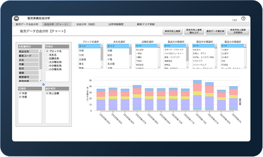販売実績自由分析ボードは、各店舗のPOSデータを基に、販売データをさまざまな切り口から分析したり、出荷履歴や顧客マスタの明細を確認したりできるボードです。見たい軸やチャートの種類を変えて自由にデータ分析ができるほか、 GEOアイテムを使えば地図上にデータをプロットすることができ、より直感的にデータを捉えることができます。