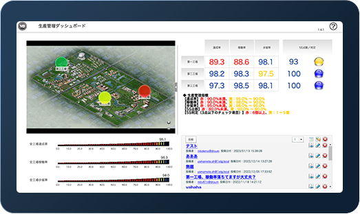 生産管理ボードでは、各工場の生産進捗や稼働率を確認することができきます。また、工場内の生産状況にドリルダウンすることで、稼働率の悪いセルの特定や、不良の発生状況・発生理由など細かく要因を探ることができます。あらかじめ設定した閾値により、閾値を超えた際にアラート通知を出すこともでき、遠隔での稼働監視が可能です。