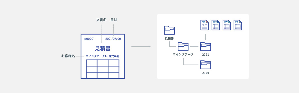 PDFやOfficeファイル、画像ファイルなどの⽇付や数字、⽂字列などの条件を読み取りあらかじめ指定したフォルダーに振り分けます。
