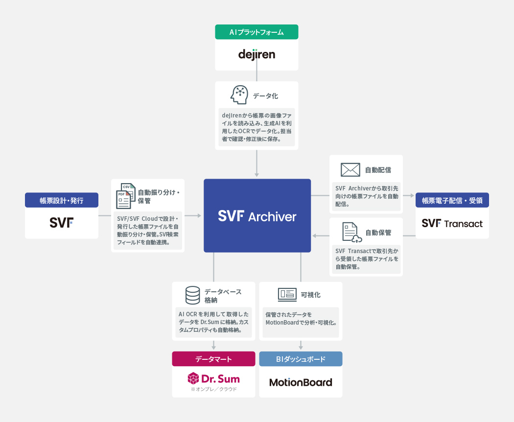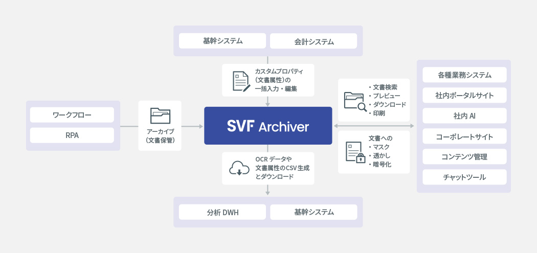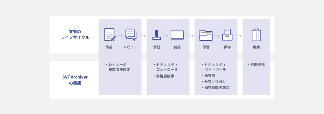SVF Archiverは、⽂書の作成から破棄までの証跡を残すことや、⽂書の保存期間に応じた⾃動削除といった操作を⾃動化します。