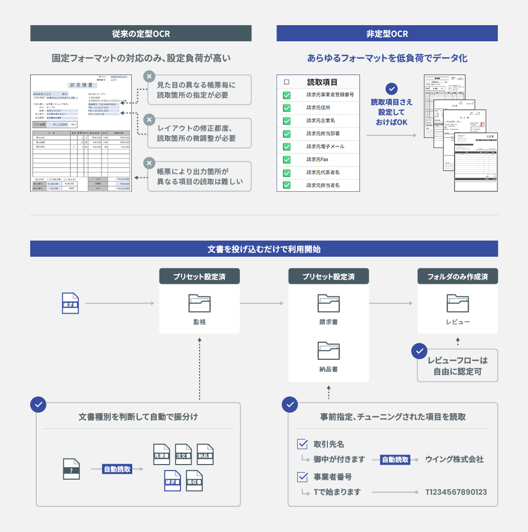 01 レイアウトが異なる請求書などの非定型帳票も、 AIが帳票データを自動で読み取ることで事前設定の負担が減ります