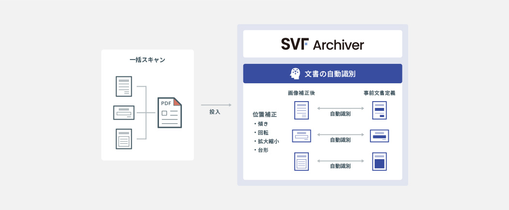 PDFファイルの内容を識別して自動仕分け、関連性のある文書をセットとして認識してデータ化できます。