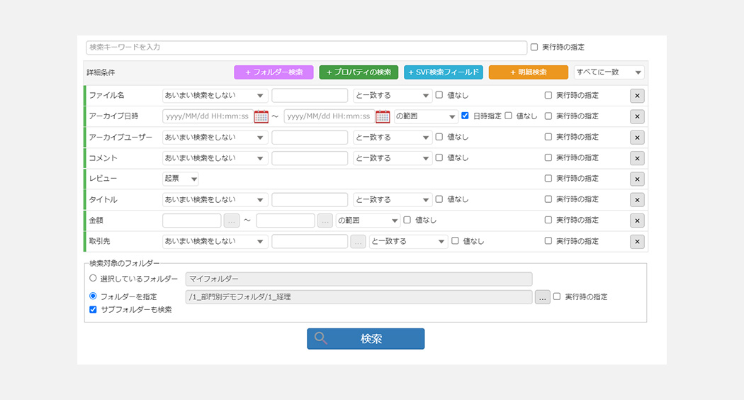 全⽂検索はもちろん、⽂字、数字、⽇付、文書IDによる部分⼀致や範囲検索が可能です。