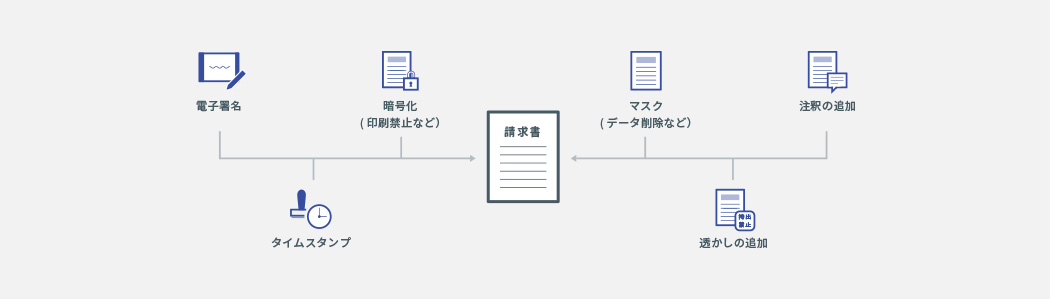 原本のPDFに⼿を加えることなく、仮想PDFでパスワード設定や印刷不可、透かしやマスク、墨消しなど、細かい設定が可能です。また、電⼦⽂書の信頼性を向上させるタイムスタンプ(時刻認証)/長期署名をPDFに付与することができます。