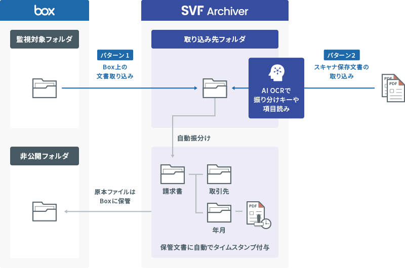 SVF Archiverにアップロードし(パターン❶)または、スキャナ保存した文書SVF Archiverに取り込み(パターン❷)、タイムスタンプ付与、またAI OCRによる読取り結果を検索データとして付与原本ファイルをBoxに保管することで、電帳法が求める電子取引要件に対応した運用が可能になります