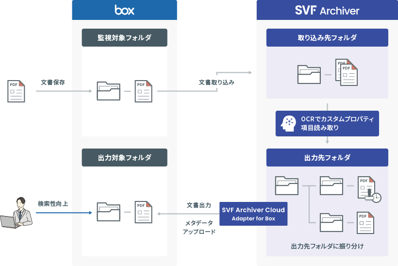 SVF Archiver上の文書が持つカスタムプロパティ情報を、Box上での検索などに必要なメタデータに自動的に反映し、Boxの対象フォルダに自動で出力できます。BoxからSVF Archiverに取り込んだ文書に、