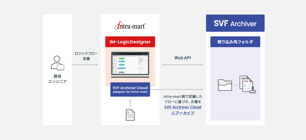 SVF Archiver Cloud Adapter for intra-martは、intra-martのIM-LogicDesignerで利用できるタスクとして提供されます。アプリケーション開発エンジニアが、IM-LogicDesignerの機能であるロジックフロー定義により連携、SVF Archiver上の指定のフォルダにアーカイブし、保管・参照ができるようになります。