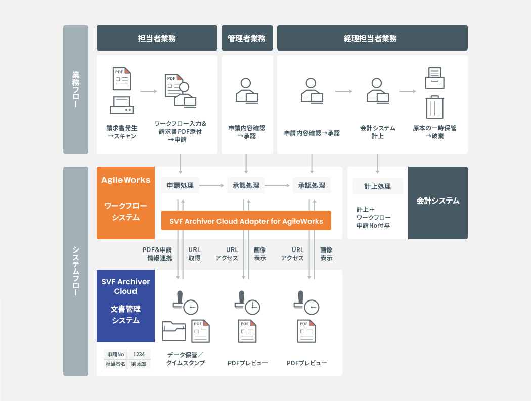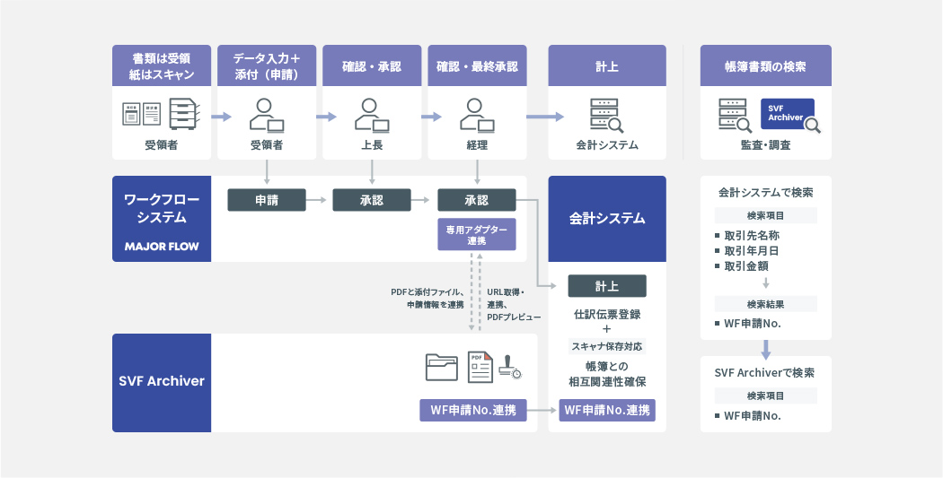 本オプションを利用することでMAJOR FLOW Zと、SVF Archiverを連携させ、MAJOR FLOW Z内で行われた申請の内容と関連する書類を、最終承認が終わったタイミングでSVF Archiverに一元的に管理することが可能となります。