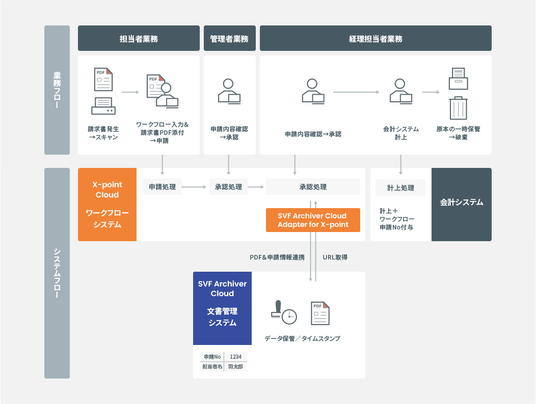 X-point Cloud からの申請情報や添付の文書をSVF Archiverで保管・閲覧することができます。