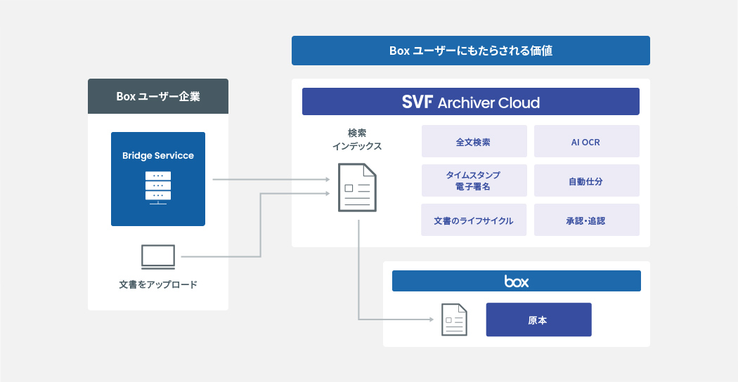 SVF Archiverに取り込んだ⽂書の原本をBoxに格納することが可能です(標準機能として搭載)。