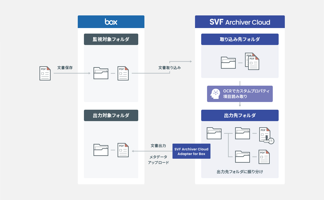 また、SVF Archiverにより整理された文書をBox上の指定フォルダに、自動出力することもでき、現場ユーザーが使い慣れたBoxでの文書活用を促進することができます。