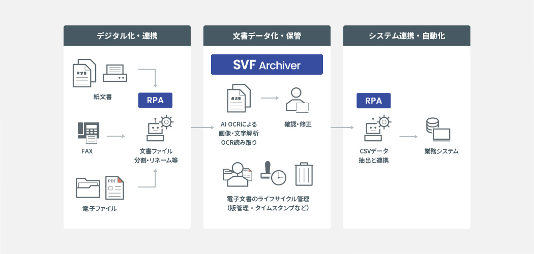 SVF ArchiverのAI OCRで紙文書をデータ化し、RPAによってシステムへ自動連携できます。