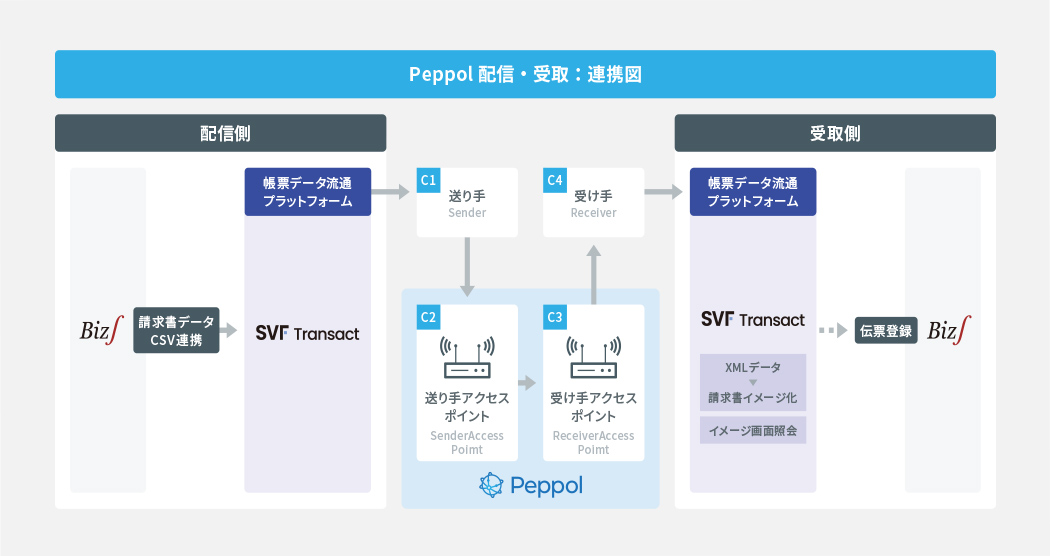 配信(請求)企業側では「Biz∫(ビズインテグラル)」で作成された請求データを「SVF Archiver」に連携し、Peppolネットワーク経由で受取先に配信を行うことができます。一方、受取(被請求)企業側では受信したPeppolデータ(xmlフォーマット)が請求書フォーマットに変換され、請求データの照会が可能になります。
