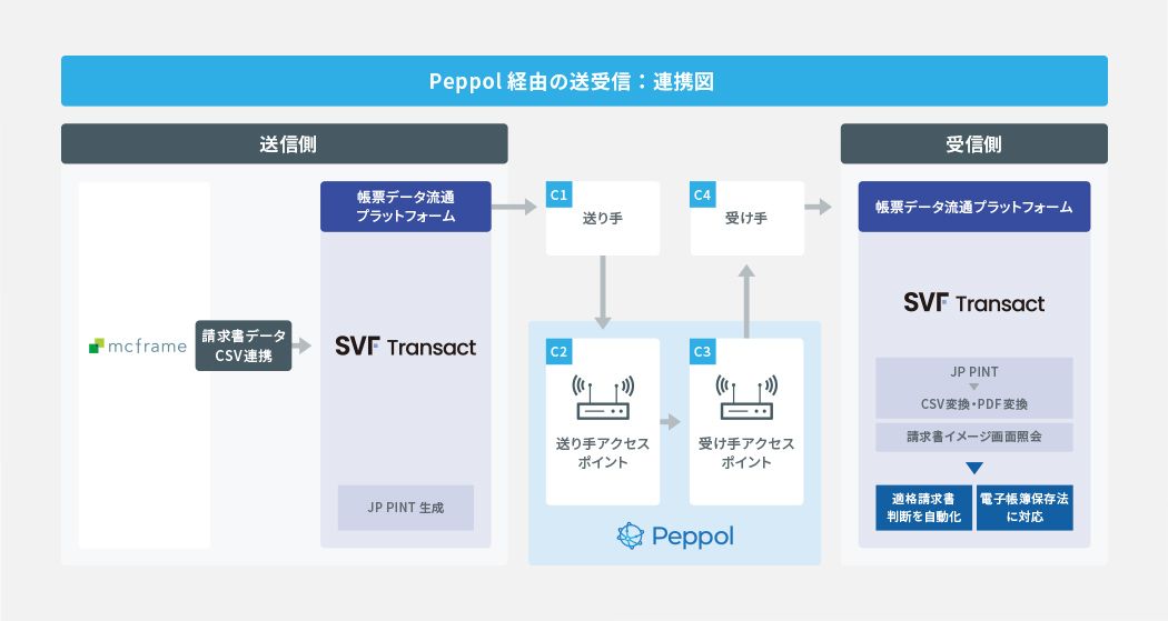 「mcframe」は「SVF Archiver」と連携したデジタルインボイスの発行および受領に対応することができ、取引先が異なるWeb請求システムを利用している場合でもPeppolに準拠して請求データをスムーズにやり取りすることが可能になります。
