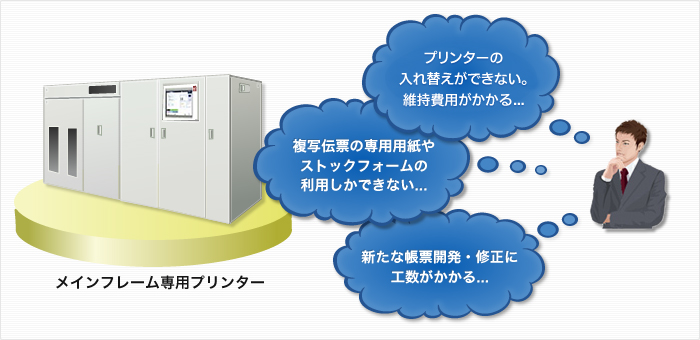 メインフレームの場合、フォームオーバーレイやスプールデータの形式がメーカーによって特定されているため変更も利かず、その結果「プリンターの入れ替えができない・維持費用がかかる」「複写伝票の専用用紙やストックフォームの利用しかできない」という問題に加え、さらには「自由な帳票表現・設計ができない」「帳票設計にはプリンターごとの専用ツールが必要なため、新たな帳票開発・修正に工数がかかる」などの弊害が生まれるようになりました。