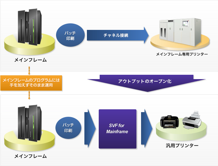 「SVF for Mainframe」は、メインフレームのプログラムには手を入れず、帳票出力部分をオープン環境へ移行するためのコネクター機能を提供する、アウトプットのオープン化ソリューションです。メインフレームのフォームオーバーレイ形式をSVFフォームに変換し、メインフレームの帳票用データを自動変換することで、メインフレームの帳票と同じフォームの帳票を汎用プリンターから出力することが可能となります。