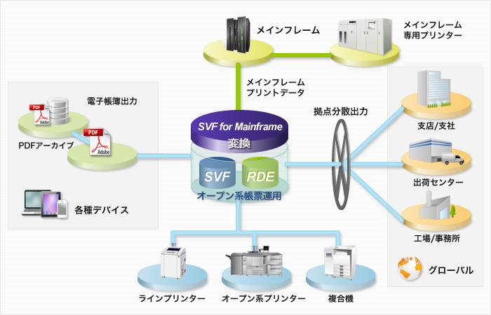プリンターでの印刷に加え、PDFファイルによる帳票出力や電子保存も可能です。帳票出力をSVFに移行してオープン化することで、従来の大量高品質印刷のほか、拠点や支社ごとの分散出力、PDF化による情報共有・活用が促進します。また、タブレットなどスマートデバイス経由で帳票の確認や変更ができるようになるため、運用の幅が飛躍的に拡がります。
