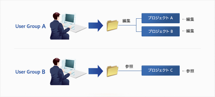 プロジェクトを保管するディレクトリ単位でのアクセス権限の設定を行うことができます。開発対象の帳票ごとにきめ細かい設定を行うことができるため、安全性の高い開発環境を確保することができます。