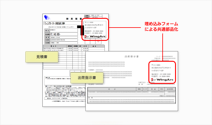 見積書や請求書、納品書、出荷指示書など帳票の種類は別でも、社名やロゴ、住所などは同一の内容を記載するケースが多くあります。このような共通する部分は埋め込みフォームによって部品化することで、複数の帳票で利用できます。既存帳票のメンテナンスにおける、都度修正や変更漏れをなくし、新規帳票の作成での工数削減にも効果を発揮します。