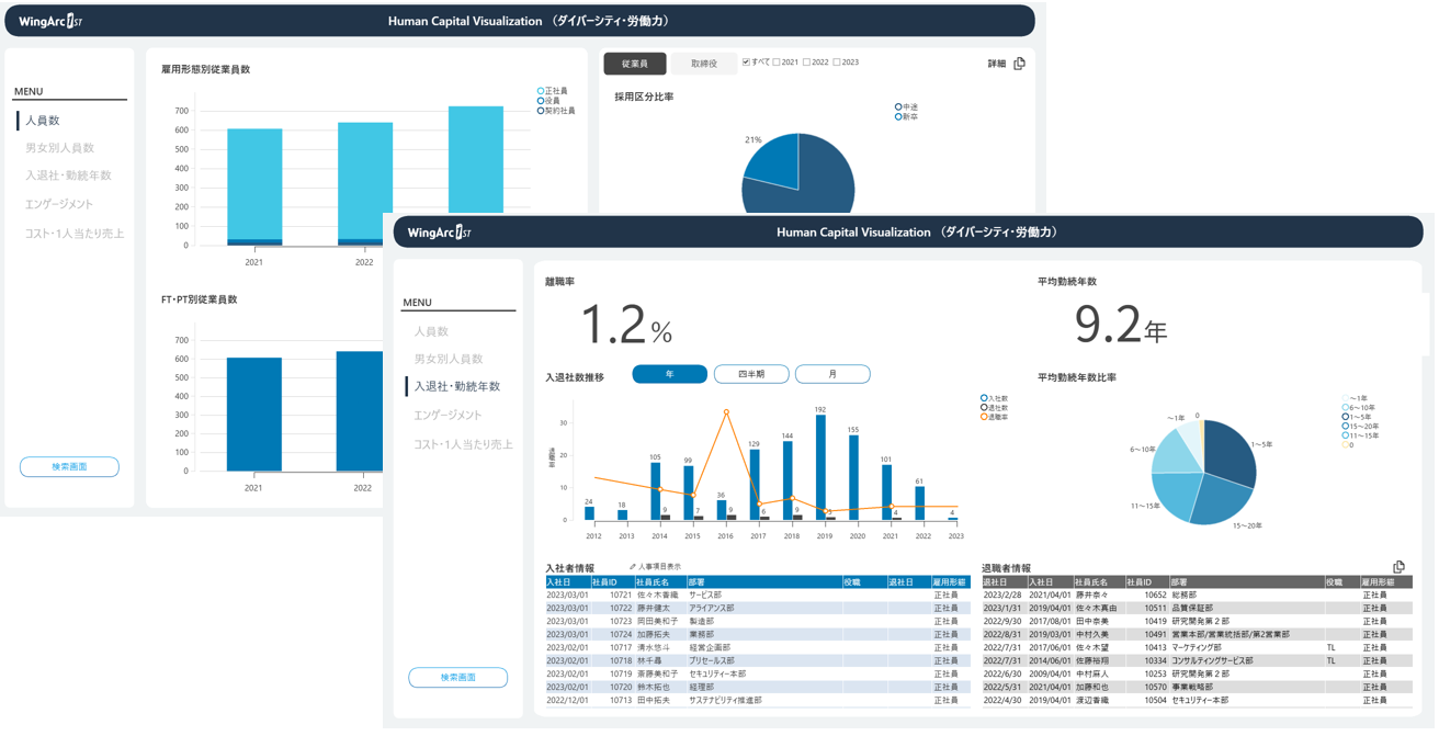 このダッシュボードは、人的資本の管理を目的に社員数や年齢構成、男女比などを可視化し、ISO30414やIR報告に活用できます。経営企画やサステナ部門と共通認識を持ちながら、Human Capital Reportの作成を効率化します。