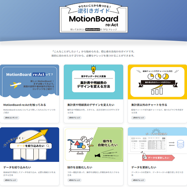 既にMotionBoardをご利用中の方が、もっとMotionBoardを活用するためのヒントが得られる情報サイトです。よくあるお悩みと解決のヒントをコンパクトな動画で確認できます。