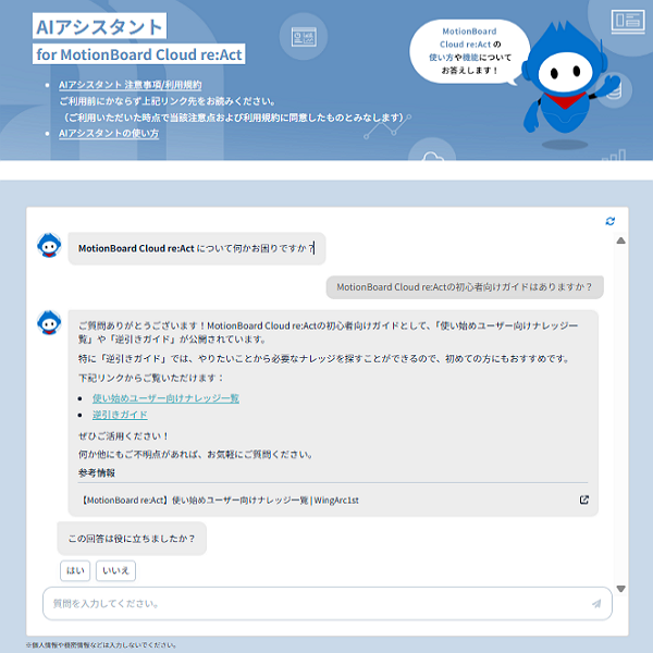 チャットボットが、対話型で質問にお答えするサポートサービスです。製品に関する疑問や使い方を24時間(年中無休)リアルタイムに解決できます。